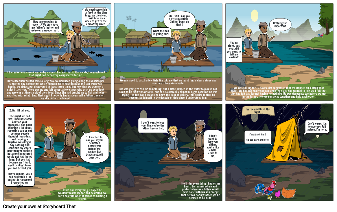 We was sailing for 10 hours, Jim suggested that we stopped on a small spot quiet. We had not really spoken since the slave had wanted to join us, I felt that Jim had felt bad for not having helped him. He was desperate too before we met in the forest, now we run away together and help each other.