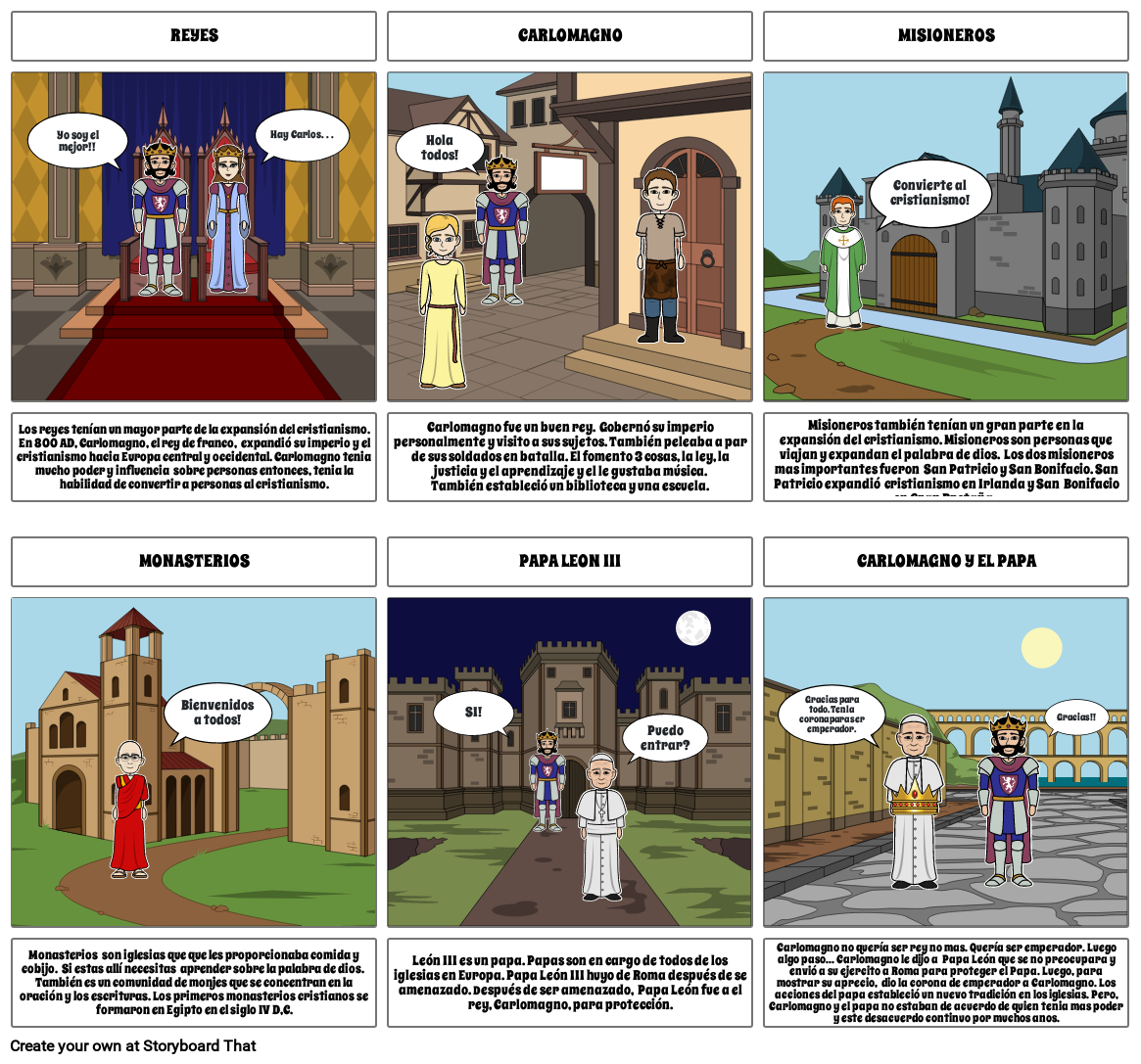 Carlomagno no quería ser rey no mas. Quería ser emperador. Luego algo paso... Carlomagno le dijo a  Papa León que se no preocupara y envió a su ejercito a Roma para proteger el Papa. Luego, para mostrar su aprecio,  dio la corona de emperador a Carlomagno. Los acciones del papa estableció un nuevo tradición en los iglesias. Pero, Carlomagno y el papa no estaban de acuerdo de quien tenia mas poder y este desacuerdo continuo por muchos anos.