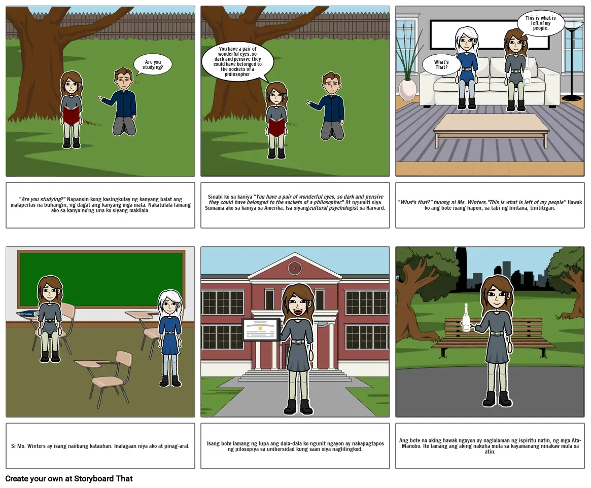 Sinabi ko sa kaniya "You have a pair of wonderful eyes, so dark and pensive they could have belonged to the sockets of a philosopher." At ngumiti siya. Sumama ako sa kaniya sa Amerika. Isa siyangcultural psychologist sa Harvard.