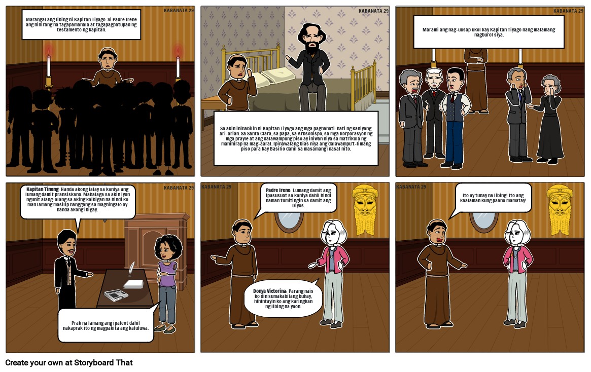 Sa akin inihabilin ni Kapitan Tiyago ang mga paghahati-hati ng kaniyang ari-arian. Sa Santa Clara, sa papa, sa Arbsobispo, sa mga korporasyon ng mga prayle at ang dalawampung piso ay iniwan niya sa matrikula ng mahihirap na mag-aaral. Ipinawalang bias niya ang dalawampu't-limang piso para kay Basilio dahil sa masamang inasal nito.