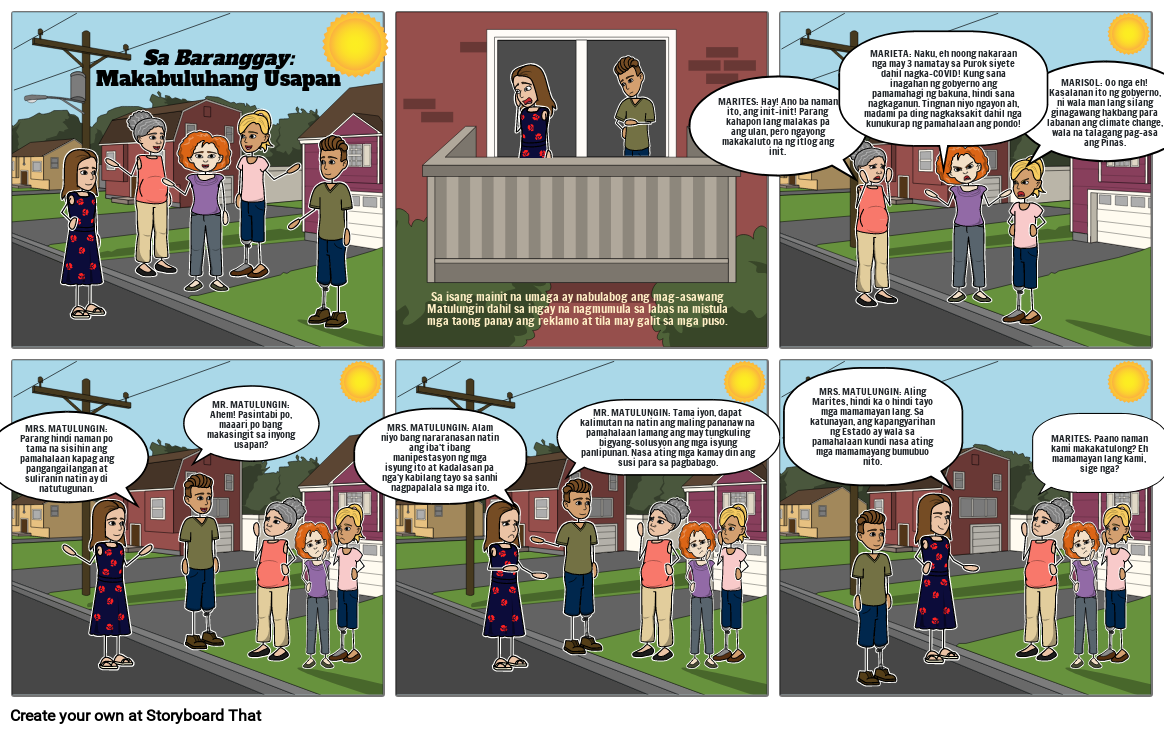 Sa isang mainit na umaga ay nabulabog ang mag-asawang Matulungin dahil sa ingay na nagmumula sa labas na mistula mga taong panay ang reklamo at tila may galit sa mga puso.