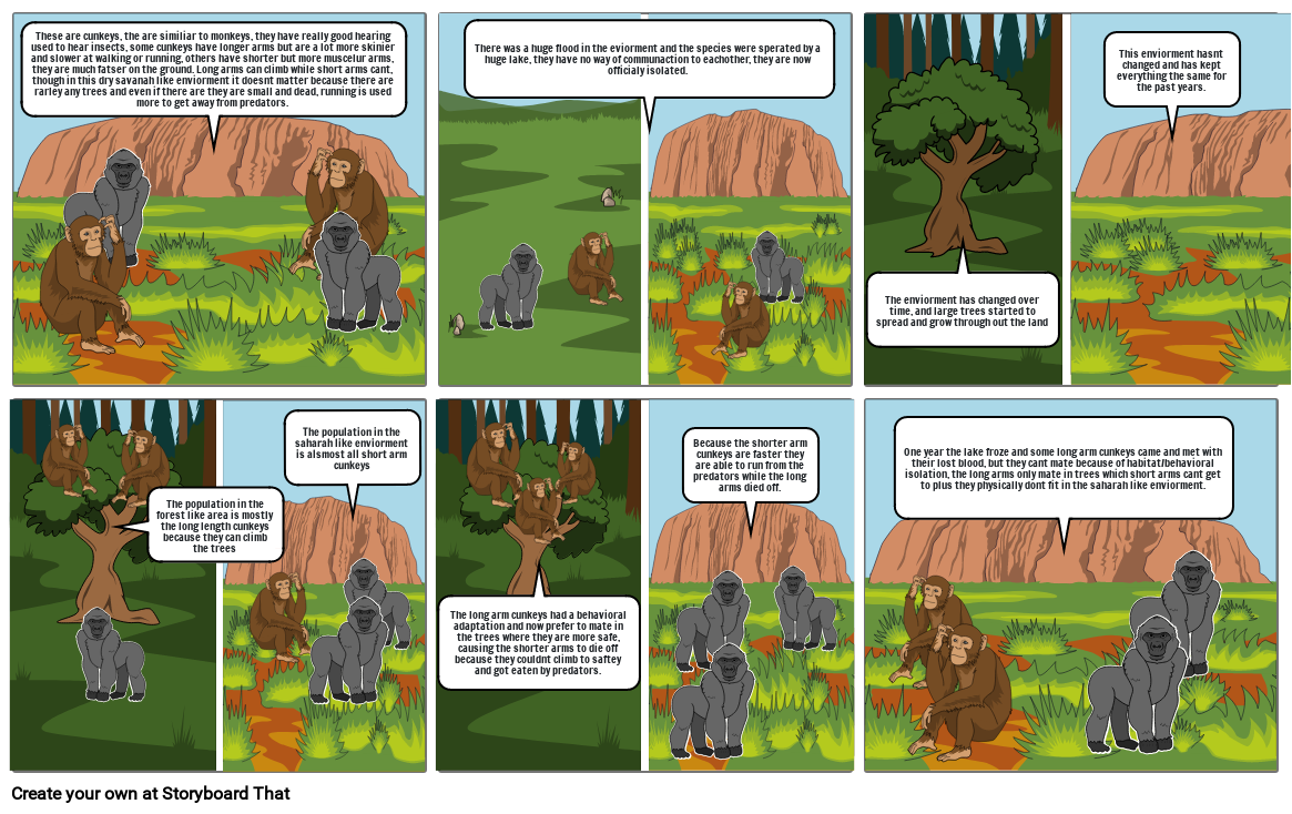 One year the lake froze and some long arm cunkeys came and met with their lost blood, but they cant mate because of habitat/behavioral isolation, the long arms only mate in trees which short arms cant get to plus they physically dont fit in the saharah like enviorment.