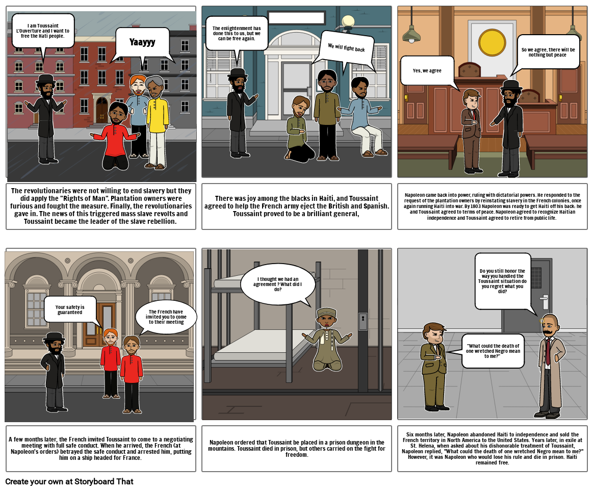 Six months later, Napoleon abandoned Haiti to independence and sold the French territory in North America to the United States. Years later, in exile at St. Helena, when asked about his dishonorable treatment of Toussaint, Napoleon replied, "What could the death of one wretched Negro mean to me?" However, it was Napoleon who would lose his rule and die in prison. Haiti remained free.
