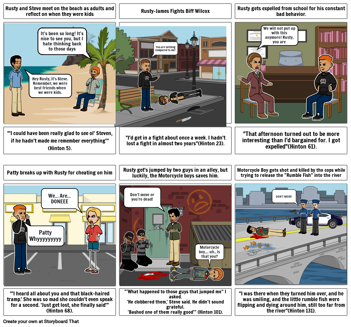 Motorcycle Boy gets shot and killed by the cops while trying to release the "Rumble Fish" into the river