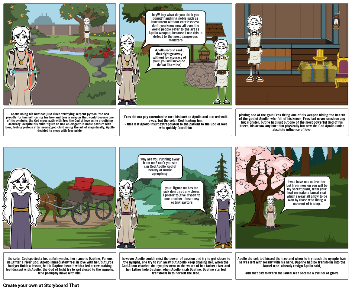 the solar God spotted a beautiful nymphs, her name is Daphne, Peneus daughter a river God, Apollo immediately feel in love with her, but Eros had yet finish a lesson, he hit Daphne hearth with a led arrow making feel disgust with Apollo, the God of light try to get closed to the nymphs, who promptly move with him.