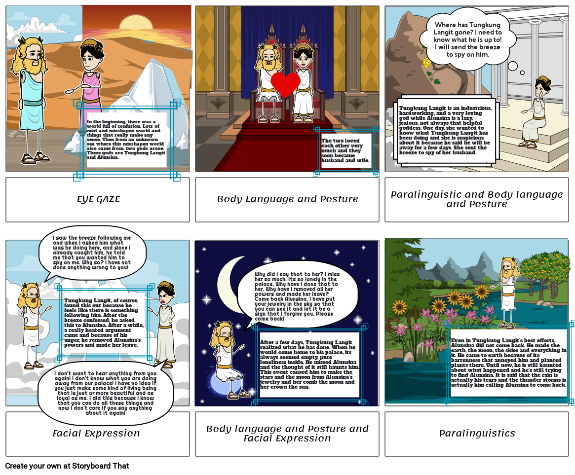 Tungkung Langit is an industrious, hardworking, and a very loving god while Alunsina is a lazy, jealous, not always that helpful goddess. One day, she wanted to know what Tungkung Langit has been doing and she is suspicious about it because he said he will be away for a few days. She sent the breeze to spy of her husband.
