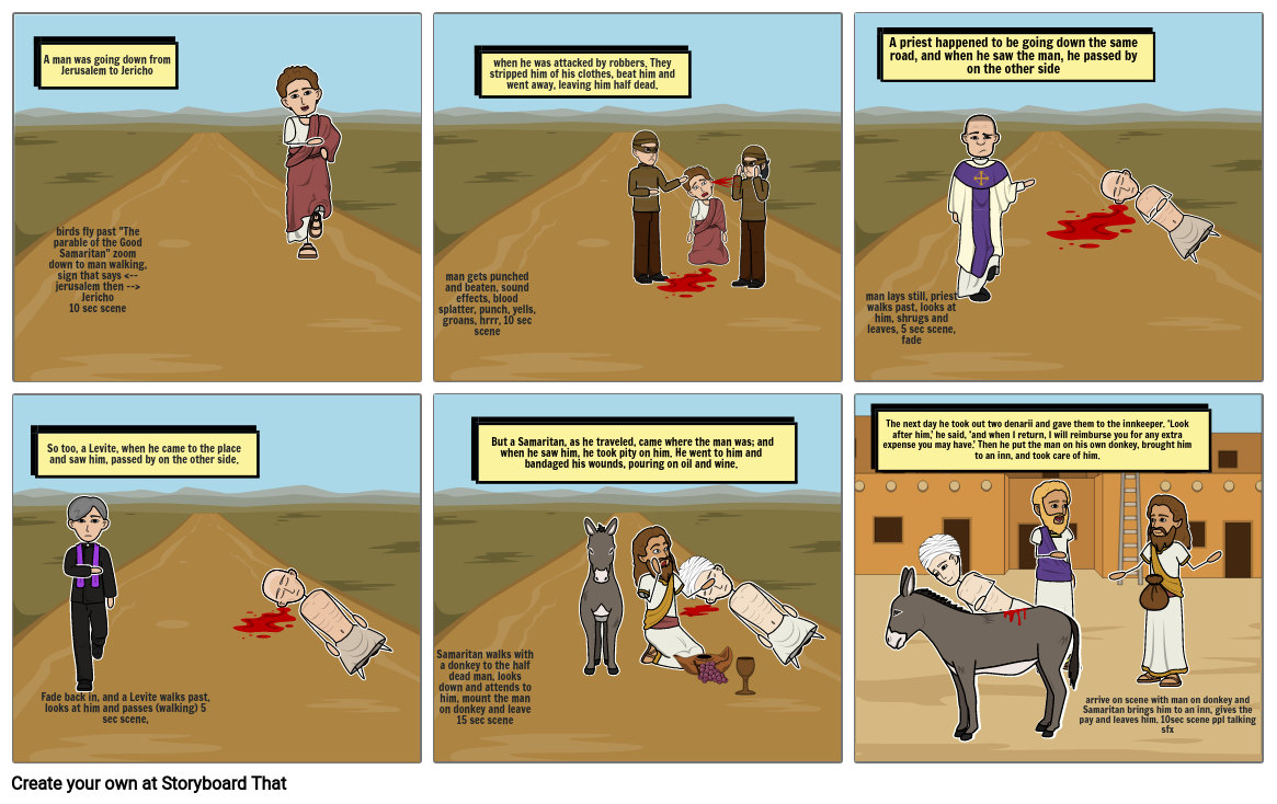 arrive on scene with man on donkey and Samaritan brings him to an inn, gives the pay and leaves him. 10sec scene ppl talking sfx
