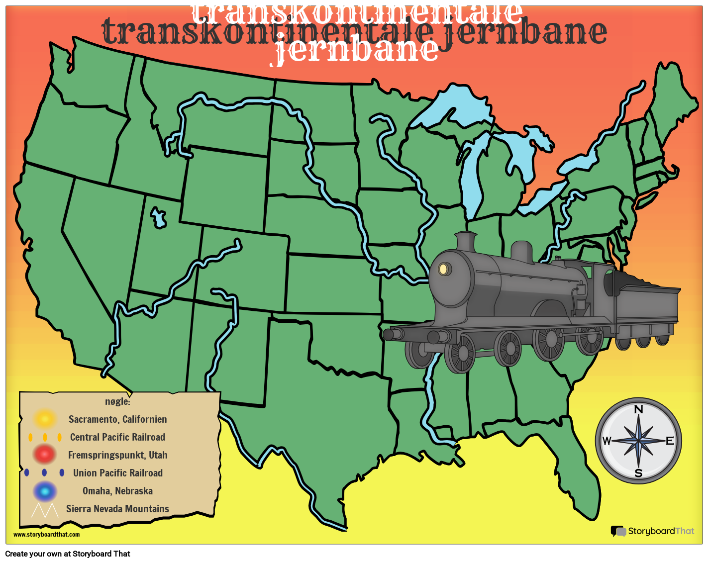 Denne kortskabelon indeholder symboler i nøglen, som de studerende kan kopiere og placere på den korrekte placering på kortet for at demonstrere deres forståelse af, hvor Central Pacific Railroad og Union Pacific Railroad byggede deres spor fra 1863-1869 og fuldførte den første transkontinentale jernbane.