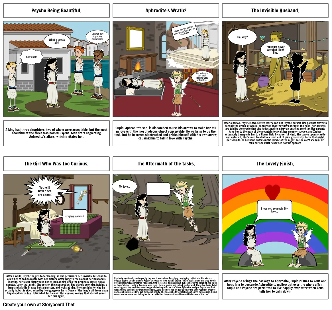 After Psyche brings the package to Aphrodite, Cupid rushes to Zeus and begs him to persuade Aphrodite to mellow out over the whole affair. Cupid and Psyche are permitted to live happily ever after when Zeus tells her to calm down.