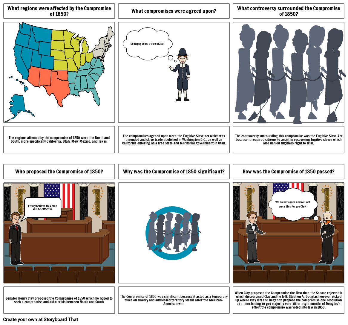 When Clay proposed the Compromise the first time the Senate rejected it which discouraged Clay and he left. Stephen A. Douglas however picked up where Clay left and began to propose the compromise one resolution at a time hoping to get majority vote. After eight months of Douglas’s effort the compromise was voted into law in 1850.