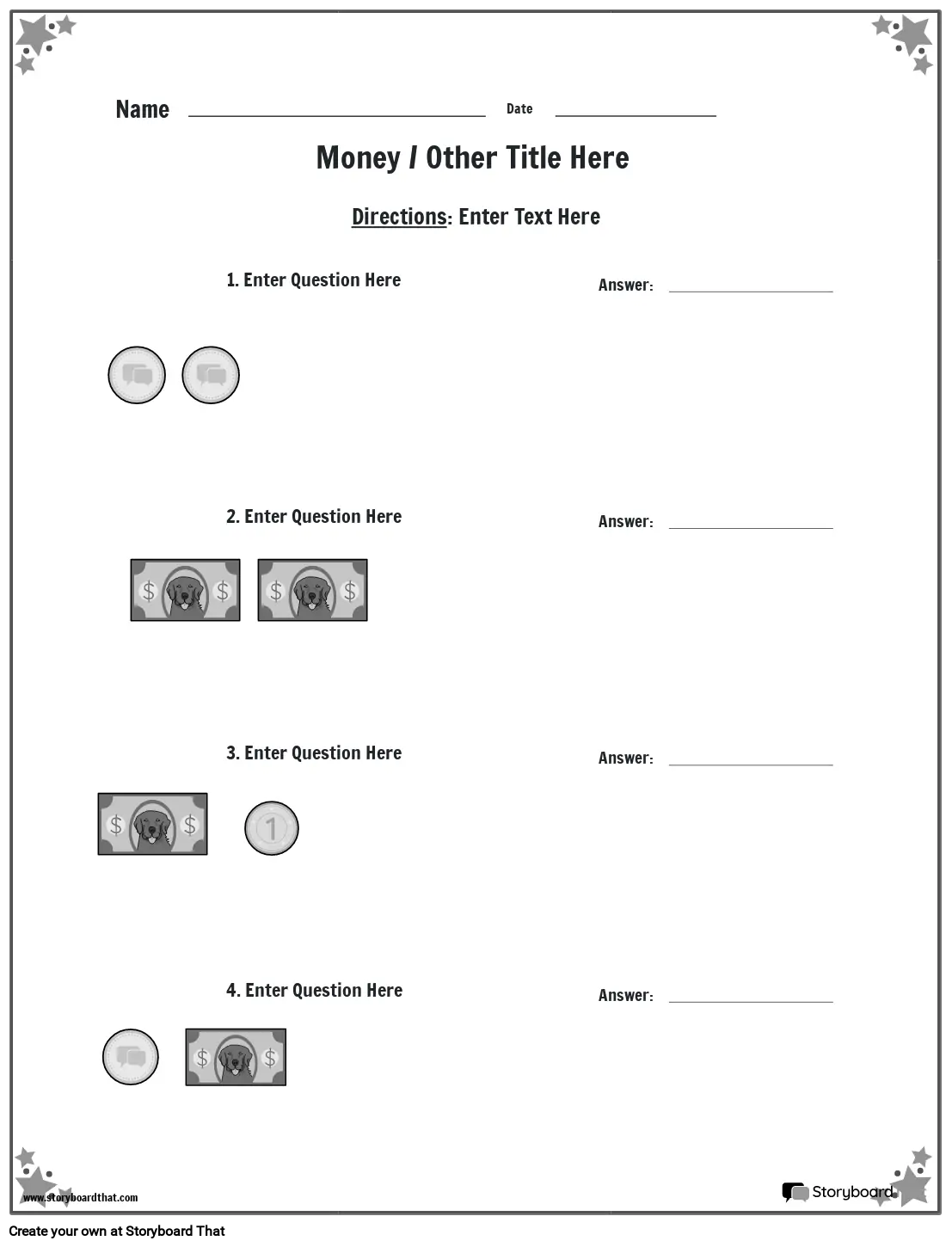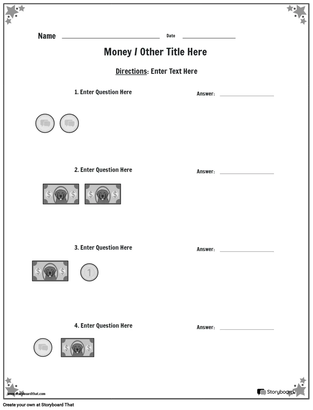Money worksheet with star border BW