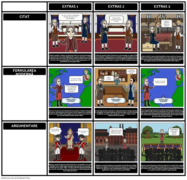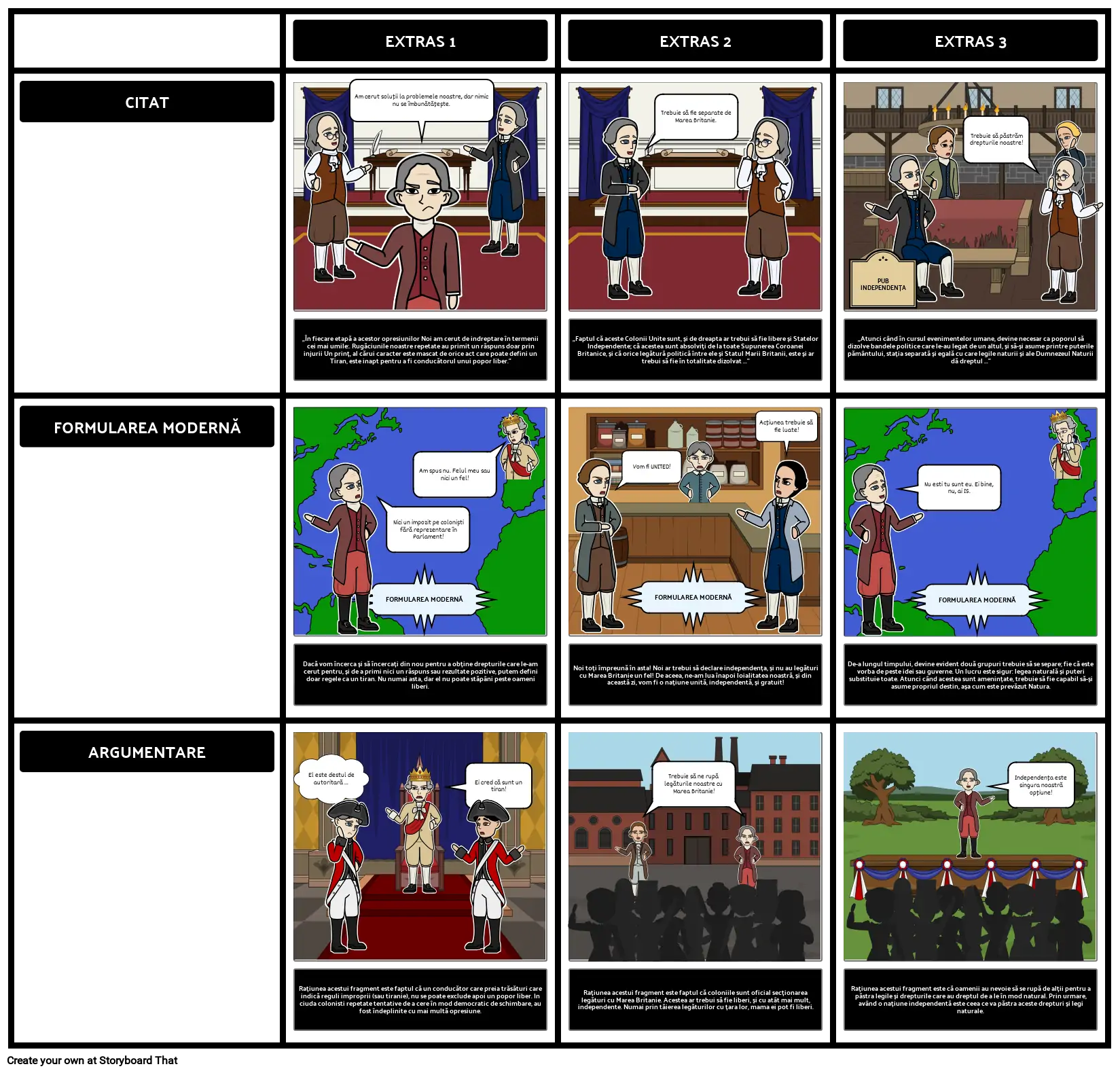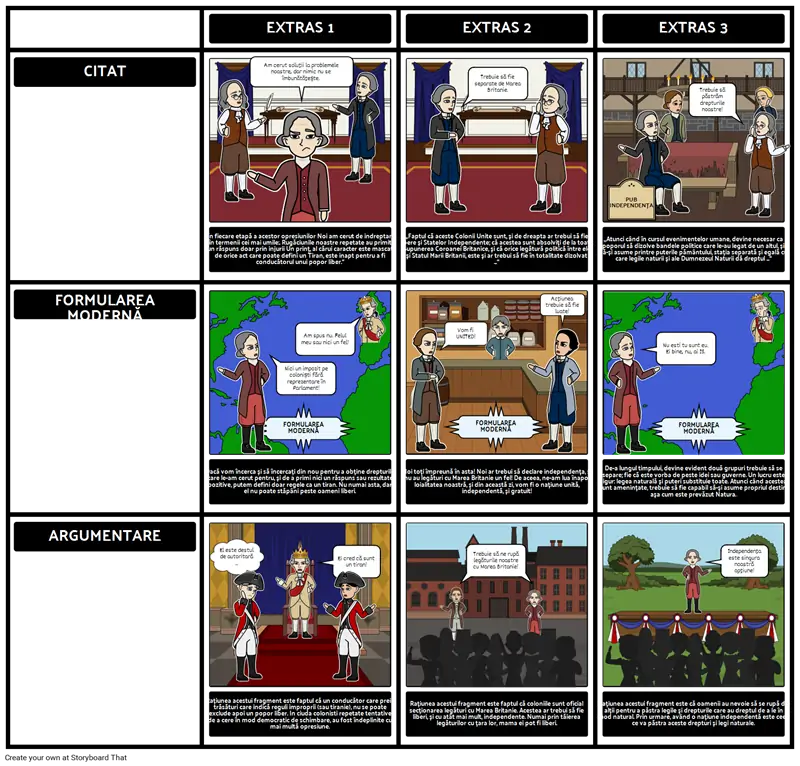 Folosind o grilă storyboard, elevii trebuie să analizeze extrase din Declarația de Independență a textului. Elevii vor folosi o axă a grilei pentru a pune un fragment specific, unul pentru justificarea lor cu privire la acest fragment, și în cele din urmă ceea ce ar putea însemna în „formulare modernă“. Prin utilizarea unei grile, elevii vor fi capabili să analizeze și să sintetizeze ceea ce ei cred Declarația spune, ce înseamnă și ce ar putea să însemne astăzi.