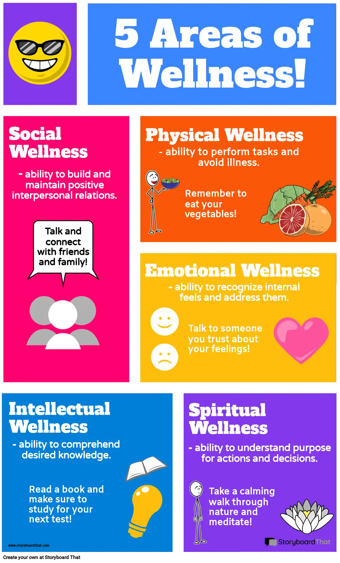 Cele cinci zone comune de bunăstare sunt fizică, emoțională, socială, intelectuală și spirituală. Elevii pot să se concentreze pe cel puțin trei dintre aceste zone pentru proiectele lor de infografice.