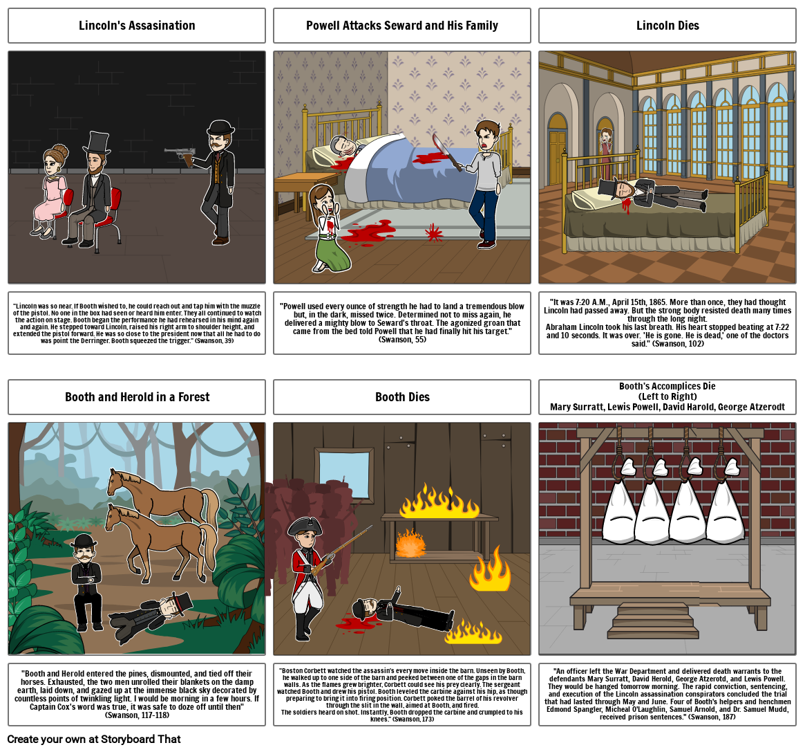 Lincoln was so near. If Booth wished to, he could reach out and tap him with the muzzle of the pistol. No one in the box had seen or heard him enter. They all continued to watch the action on stage. Booth began the performance he had rehearsed in his mind again and again. He stepped toward Lincoln, raised his right arm to shoulder height, and extended the pistol forward. He was so close to the president now that all he had to do was point the Derringer. Booth squeezed the trigger. (Swanson, 39)