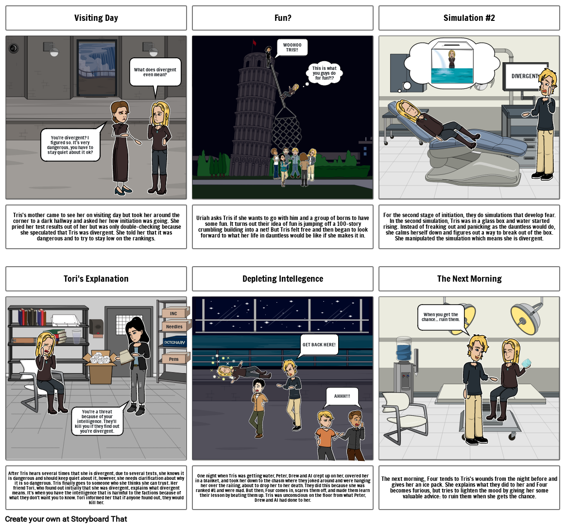 This storyboard explains six scenes from chapters 15-22 of the story "Divergent" by Veronica Roth. The six scenes chosen were based on what seems to be the main idea of where the direction of the story is heading.