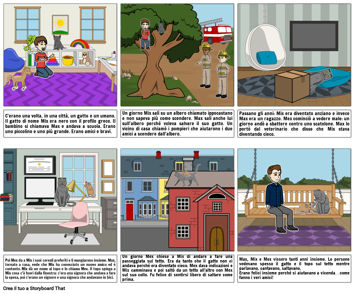 C’erano una volta, in una città, un gatto e un umano. Il gatto di nome Mix era nero con il profilo greco. Il bambino si chiamava Max e andava a scuola. Erano uno piccolino e uno più grande. Erano amici e bravi.