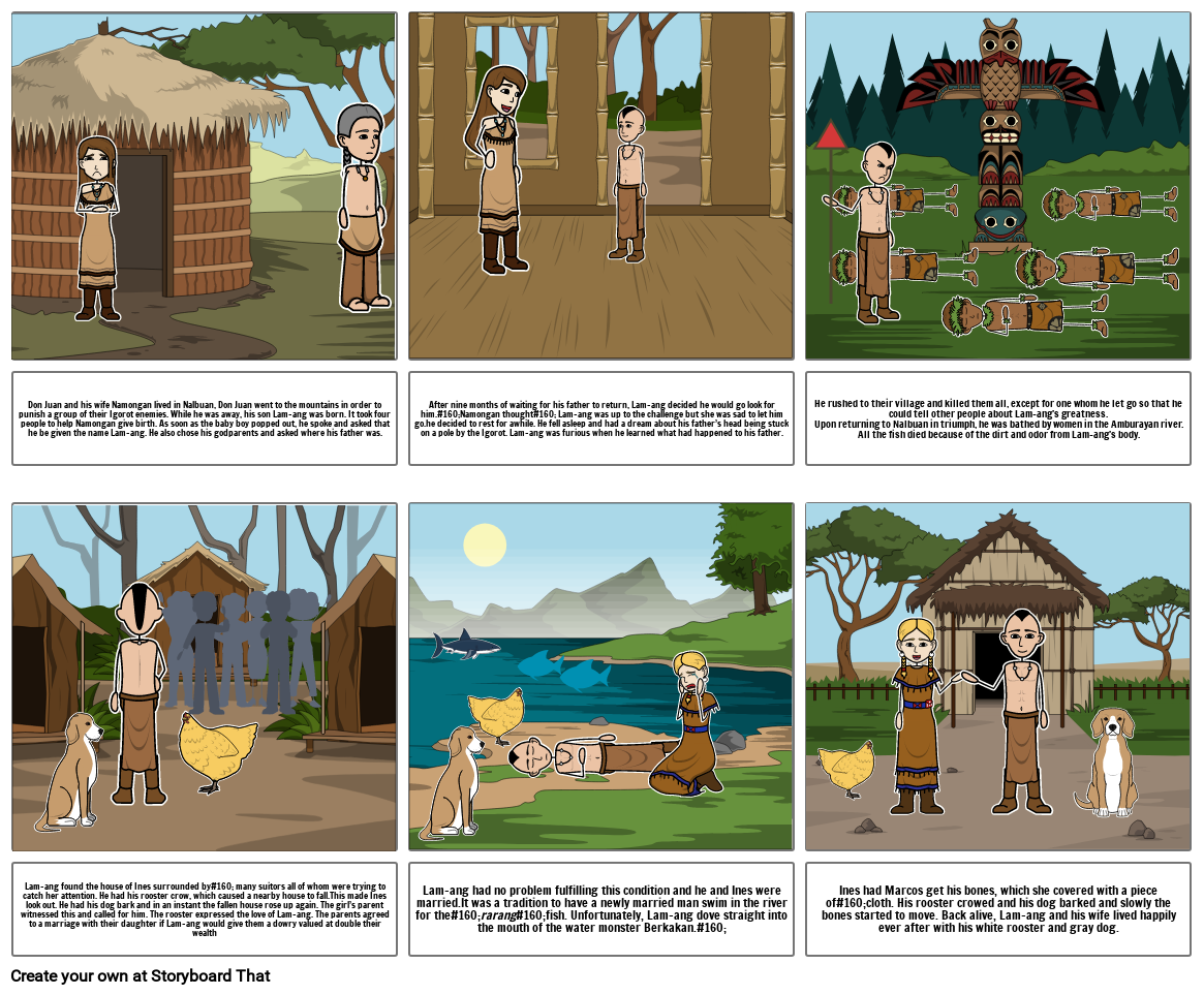 Ines had Marcos get his bones, which she covered with a piece of#160;cloth. His rooster crowed and his dog barked and slowly the bones started to move. Back alive, Lam-ang and his wife lived happily ever after with his white rooster and gray dog.