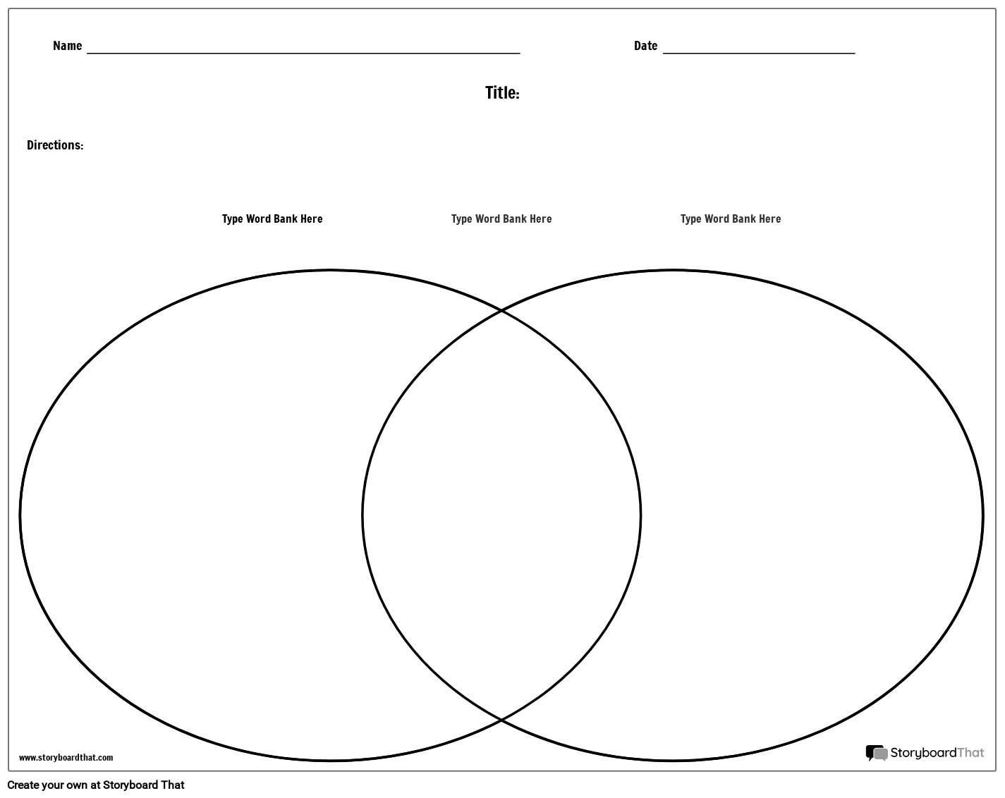 वेन डायग्राम टेम्प्लेट - लैंडस्केप ओरिएंटेशन। इस टेम्पलेट को कॉपी करें और अपनी आवश्यकताओं के लिए टेक्स्ट संपादित करें। Storyboard Creator में प्रिंट करें या उपयोग करें