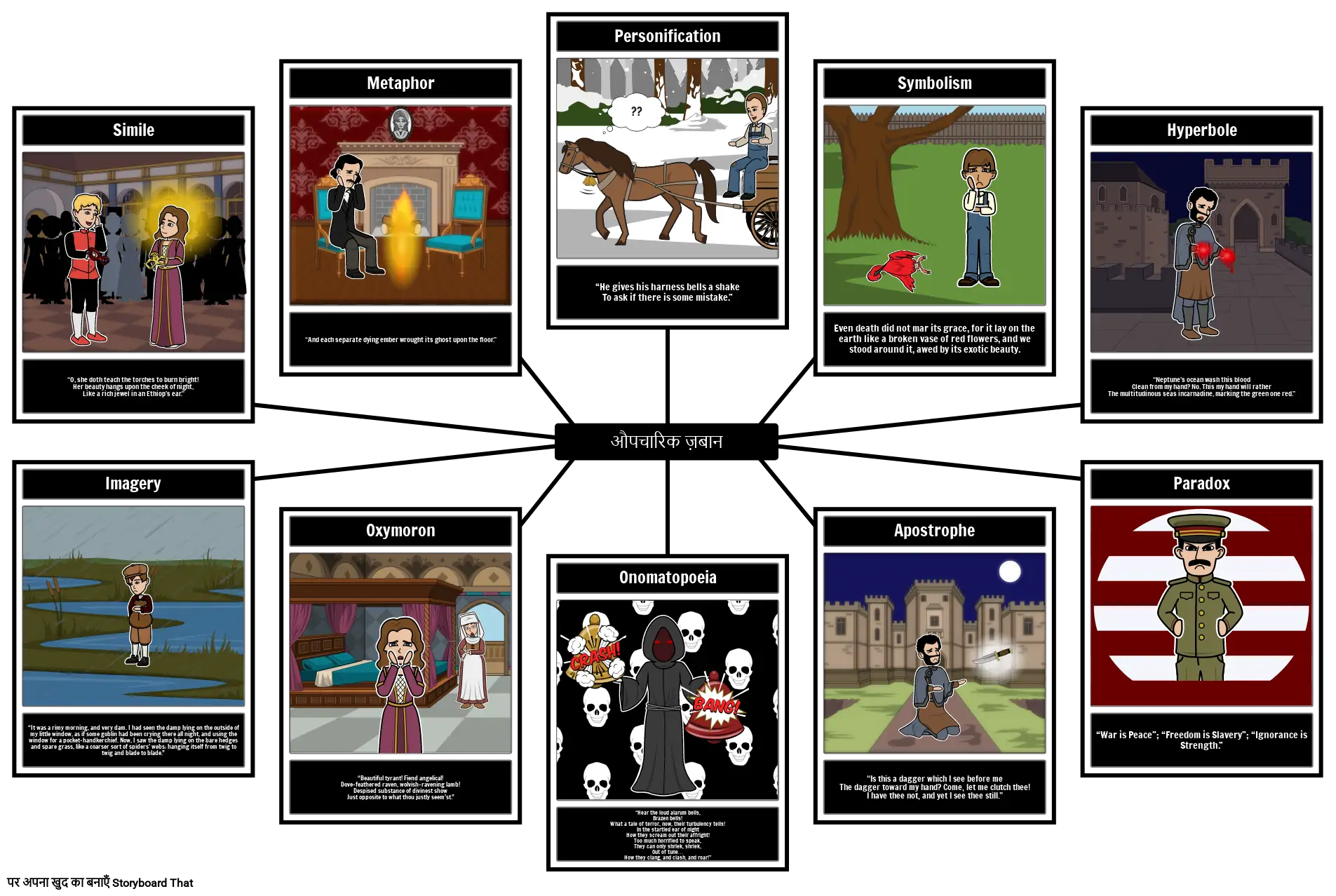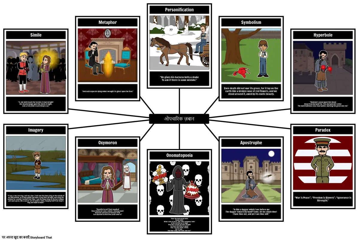 साहित्य में आलंकारिक भाषा के उदाहरण, मानवीकरण से ओनोमेटोपोइया तक।