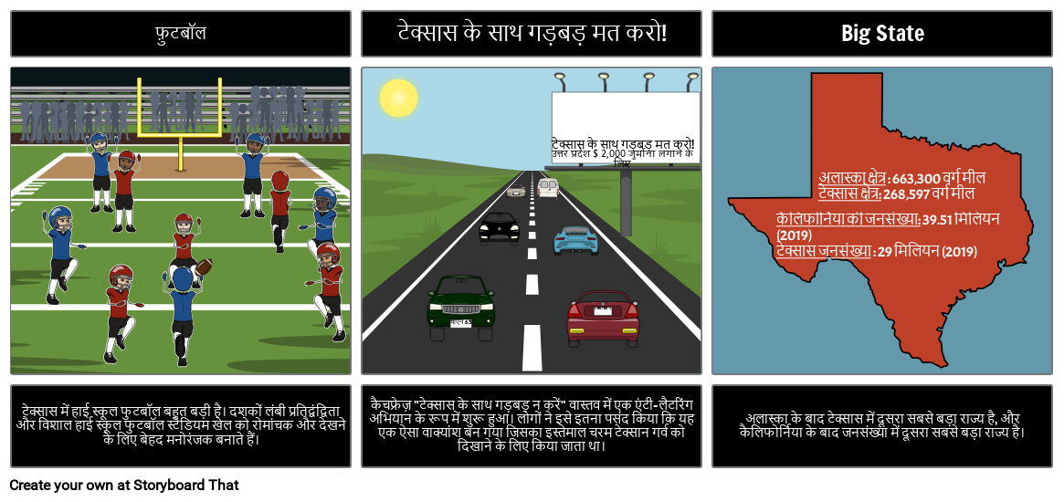 टेक्सास राज्य के बारे में कुछ मजेदार तथ्यों को दर्शाते हुए स्टोरीबोर्ड बनाएं!