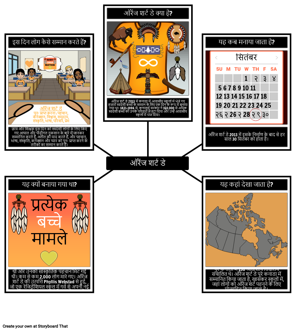 ऑरेंज शर्ट डे की शुरुआत 2013 में आवासीय विद्यालय प्रणाली के माध्यम से प्रथम राष्ट्र, इनुइट और मेटिस लोगों पर आघात की पीढ़ियों को स्वीकार करने के लिए कनाडा में हुई। इस मकड़ी के नक्शे में दिन के बारे में महत्वपूर्ण तथ्य शामिल हैं। छात्र WHAT ऑरेंज शर्ट डे पर रिसर्च कर सकते हैं, यह तब होता है, जब इसे सम्मानित किया जाता है, तो इसे क्यों बनाया गया और इस दिन लोग कैसे सम्मान करते हैं।