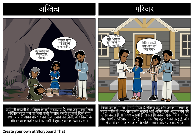 वहाँ पूरी कहानी में अस्तित्व के कई उदाहरण हैं। एक उदाहरण है जब परिवार बहुत कम या बिना पानी के साथ चलते हुए कई दिनों तक चला। पापा ने अपने परिवार को ज़िंदा रखने की ठानी, और किसी के बीमार या कमज़ोर होने पर सभी ने एक-दूसरे का ध्यान रखा।