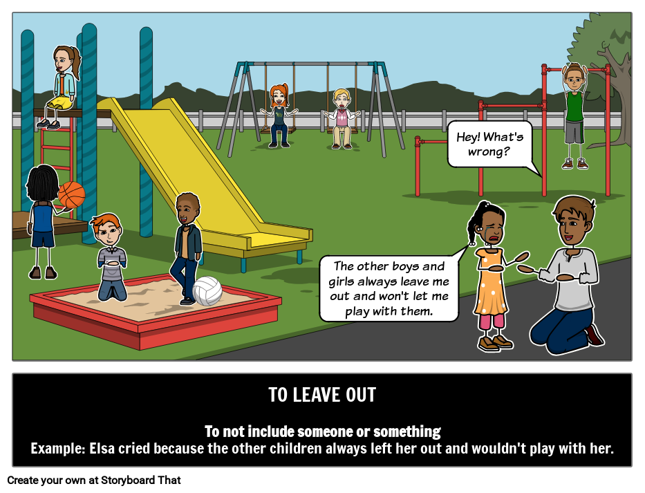 TO LEAVE OUTTo not include someone or somethingExample: Elsa cried because the other children always left her out and wouldn't play with her.