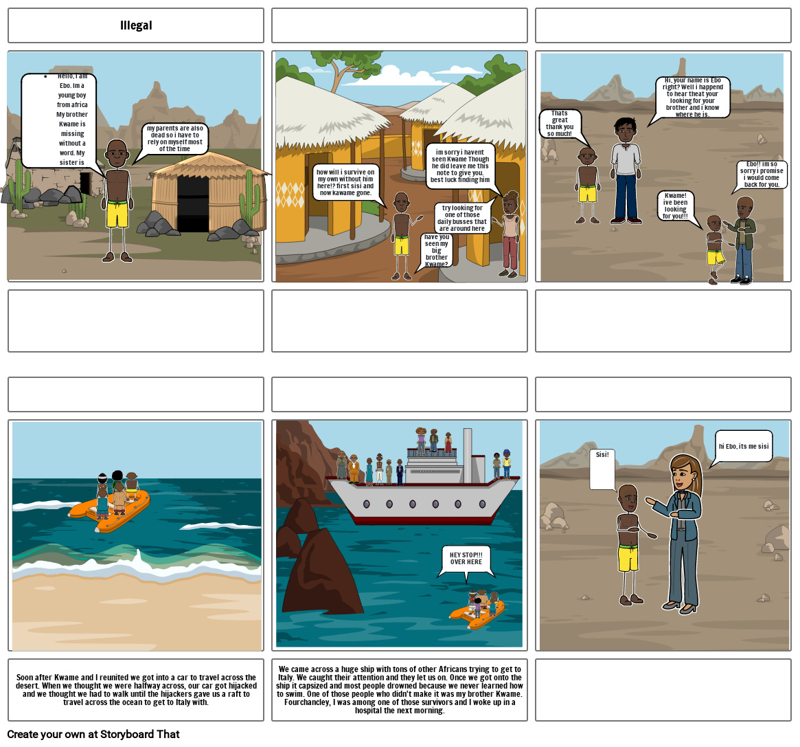 We came across a huge ship with tons of other Africans trying to get to Italy. We caught their attention and they let us on. Once we got onto the ship it capsized and most people drowned because we never learned how to swim. One of those people who didn't make it was my brother Kwame. Fourchancley, I was among one of those survivors and I woke up in a hospital the next morning.