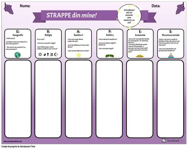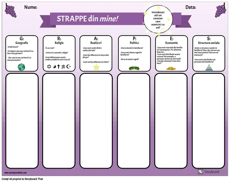 Utilizați acest organizator grafic pentru a prezenta acronimului GRAPES elevilor dvs. Elevii răspund la întrebările pentru fiecare categorie: geografie, religie, realizări, politică, economie și structură socială, reflectând asupra propriilor vieți și experiențe. După ce au avut șansa de a reflecta și de a scrie, profesorii pot conduce o discuție la clasă despre fiecare categorie. Aceasta este o activitate utilă de construire a comunității, precum și o modalitate de a introduce acest simplu organizator grafic care poate fi folosit pentru studiul fiecărei civilizații antice.