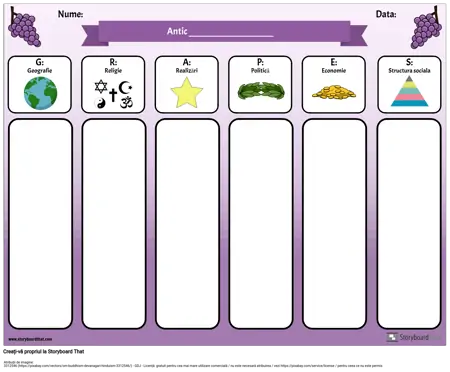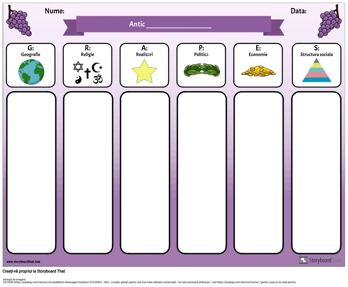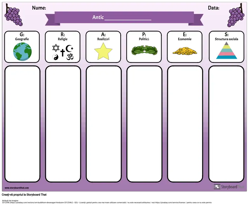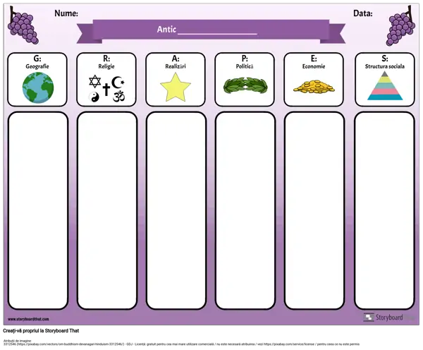 Acronimul GRAPES este un instrument util atunci când studiați despre civilizațiile antice sau diferite țări. Utilizați această diagramă GRAPES digital (cereți elevilor să își scrie notele și să adauge imagini în fiecare categorie) sau să o imprimați, iar elevii își pot scrie notele.