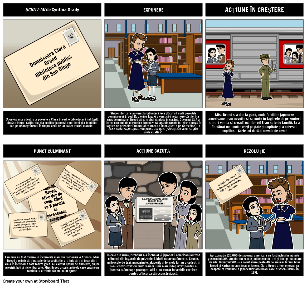Cartea, Scrieți-mi de Cynthia Grady, spune povestea adevărată a bibliotecarului din San Diego, California, Clara Breed și a familiilor japoneze americane pentru care a susținut în timpul încarcerării lor în timpul celui de-al doilea război mondial. Este o privire convingătoare asupra travestiei justiției care a fost comisă de guvernul Statelor Unite în timpul celui de-al doilea război mondial împotriva japonezilor americani. Elevii pot simți empatie pentru copiii mici care scriu scrisori către Miss Breed despre experiențele lor în timp ce studiază frumoasele ilustrații și învață despre acest capitol adesea uitat și important din istoria SUA.
