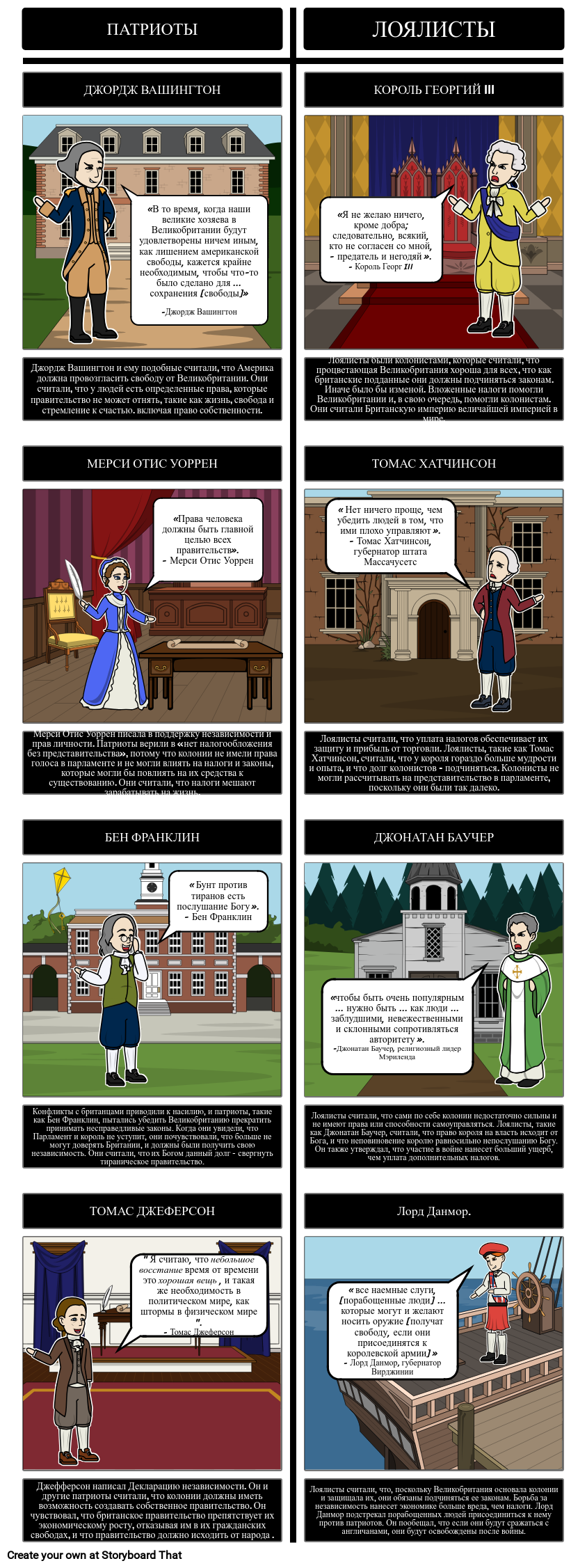 Лоялисты считали, что, поскольку Великобритания основала колонии и защищала их, они обязаны подчиняться ее законам. Борьба за независимость нанесет экономике больше вреда, чем налоги. Лорд Данмор подстрекал порабощенных людей присоединиться к нему против патриотов. Он пообещал, что если они будут сражаться с англичанами, они будут освобождены после войны.