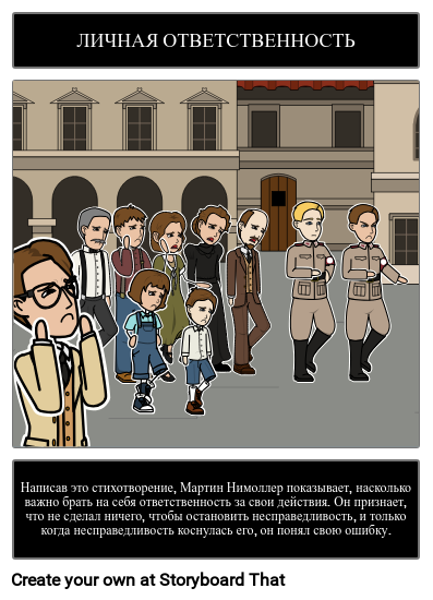 Написав это стихотворение, Мартин Нимоллер показывает, насколько важно брать на себя ответственность за свои действия. Он признает, что не сделал ничего, чтобы остановить несправедливость, и только когда несправедливость коснулась его, он понял свою ошибку.