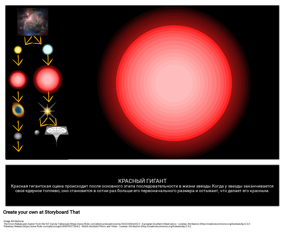 Красная гигантская сцена происходит после основного этапа последовательности в жизни звезды. Когда у звезды заканчивается свое ядерное топливо, оно становится в сотни раз больше его первоначального размера и остывает, что делает его красным.
