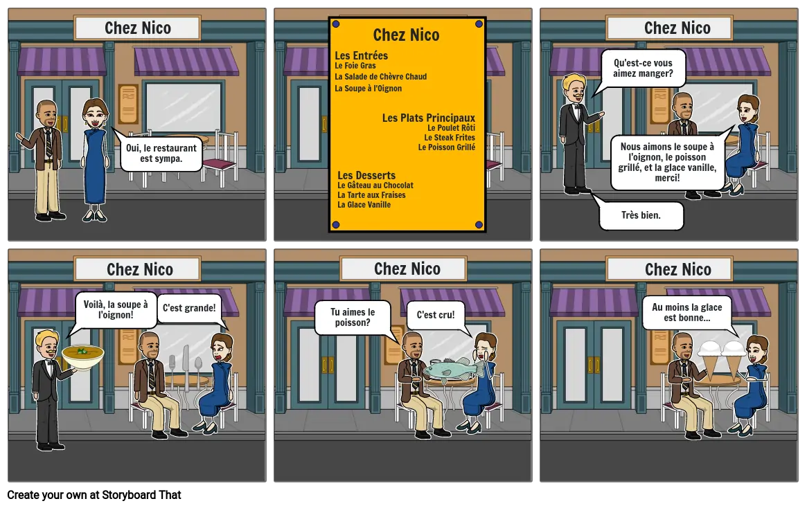 Nous aimons le soupe à l'oignon, le poisson grillé, et la glace vanille, merci!