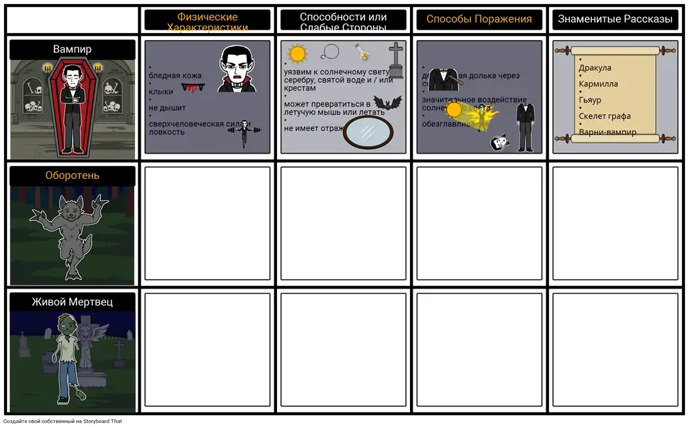 Мифы и легенды могут быть очень интересными, и они также являются важной частью литературы и поп-культуры. В этом упражнении учащиеся создают диаграмму, которая описывает различные подробности о разных монстрах. Рассмотрите возможность включения монстров, таких как ведьмы, призраки, гоблины или упыри, или используйте этот график для аналогичной деятельности с другими фантастическими созданиями, такими как единороги, драконы, феи, эльфы, русалки и т. Д.