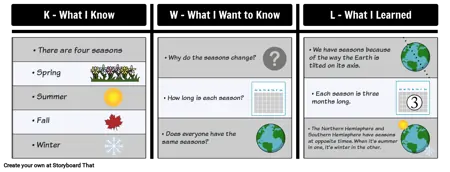 KWL charts help students organize thoughts, activate prior knowledge, and encourage curiosity. For middle schoolers, this tool makes learning about complex topics like the reason for the seasons more interactive, reflective, and student-centered.