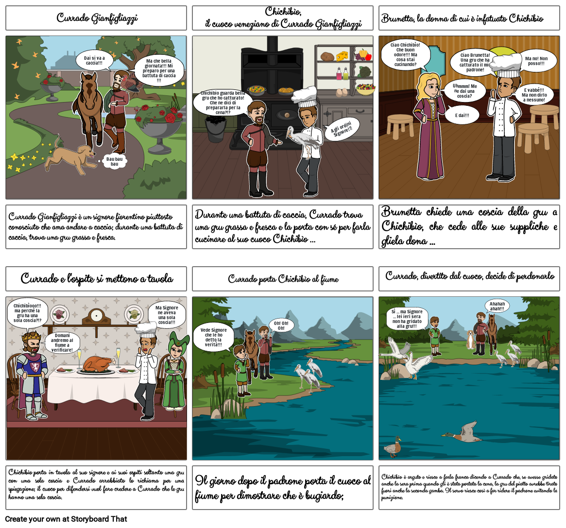 Chichibìo porta in tavola al suo signore e ai suoi ospiti soltanto una gru con una sola coscia e Currado arrabbiato lo richiama per una spiegazione; il cuoco per difendersi vuol fare credere a Currado che le gru hanno una sola coscia.