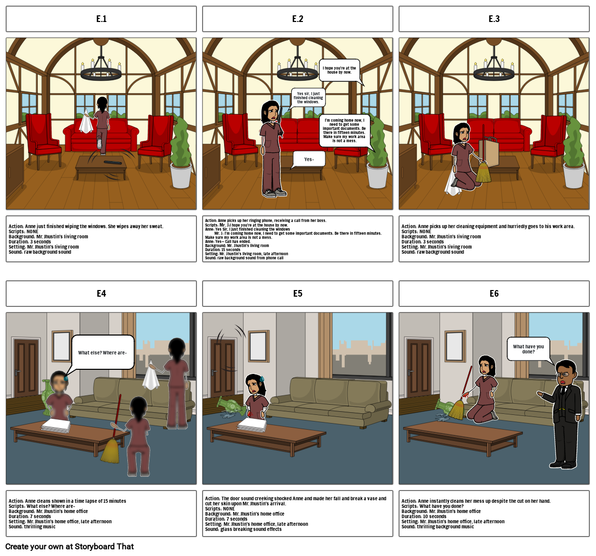 Action: Anne instantly cleans her mess up despite the cut on her hand.Scripts: What have you done?Background: Mr. Jhustin's home officeDuration: 10 secondsSetting: Mr. Jhustin's home office, late afternoonSound: thrilling background music