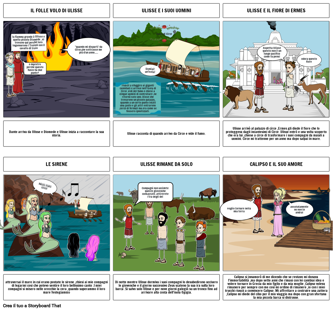 Calipso si innamorò di me dicendo che se restavo mi donava l'immortabilità ,ma dopo sette anni che rimasi con lei cambiai idea e volere tornare in Grecia da mio figlio e da mia moglie ,Calipso voleva rimanere per sempre con me così mi ordino di rimanere ,io con i miei trucchi riuscii a convincere Calipso .Mi affrettare a costruire una zattera ,Calipso mi diede del cibo per il mio viaggio ma dopo con gran sfortuna la mia piccola barca si distrusse.