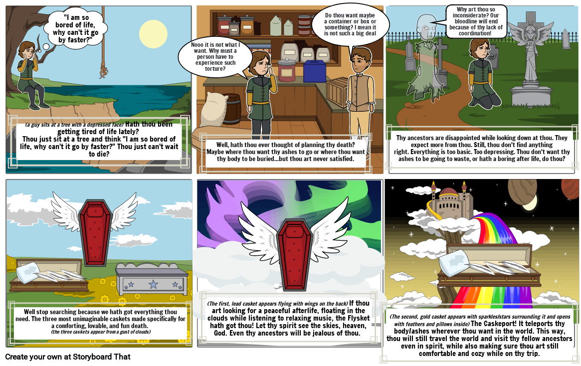 Thy ancestors are disappointed while looking down at thou. They expect more from thou. Still, thou don't find anything right. Everything is too basic. Too depressing. Thou don't want thy ashes to be going to waste, or hath a boring after life, do thou?