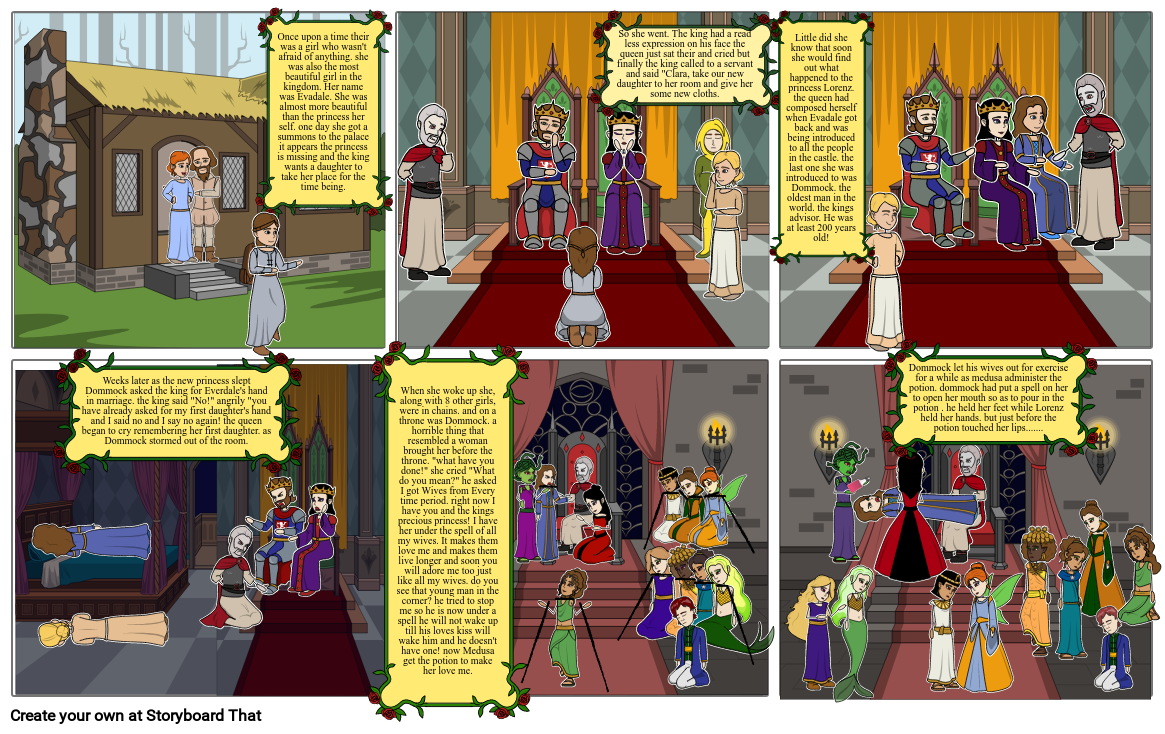 When she woke up she, along with 8 other girls, were in chains. and on a throne was Dommock. a horrible thing that resembled a woman brought her before the throne. "what have you done!" she cried "What do you mean?" he asked I got Wives from Every time period. right now I have you and the kings precious princess! I have her under the spell of all my wives. It makes them love me and makes them live longer and soon you will adore me too just like all my wives. do you see that young man in the corner? he tried to stop me so he is now under a spell he will not wake up till his loves kiss will wake him and he doesn't have one! now Medusa get the potion to make her love me.