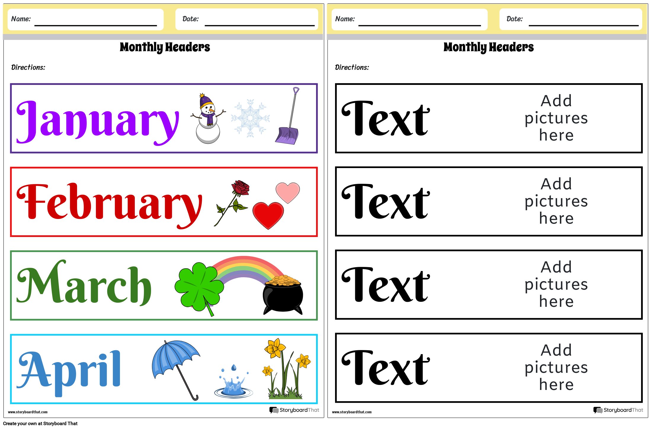 Тези заглавки могат да се използват за създаване на клас или индивидуален календар. Учениците могат сами да създават работните листове, като добавят изкуство и дизайни, които представят всеки месец, или учителите могат да се забавляват, създавайки свои собствени декорации!