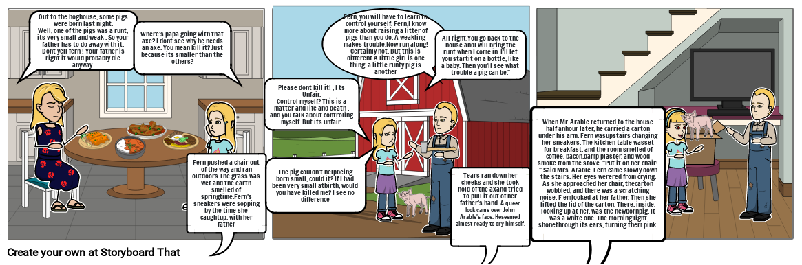 Fern, you will have to learn to control yourself. Fern,I know more about raising a litter of pigs than you do. A weakling makes trouble.Now run along! Certainly not, But this is different.A little girl is one thing, a little runty pig is another