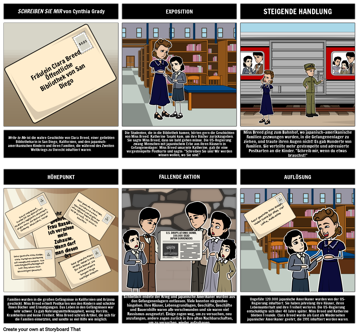 Das Buch Write to Me von Cynthia Grady erzählt die wahre Geschichte einer Bibliothekarin aus San Diego, Kalifornien, Clara Breed und der japanisch-amerikanischen Familien, für die sie sich während ihrer Inhaftierung während des Zweiten Weltkriegs eingesetzt hat. Es ist ein überzeugender Blick auf die Travestie der Gerechtigkeit, die die Regierung der Vereinigten Staaten während des Zweiten Weltkriegs gegen japanische Amerikaner begangen hat. Die Schüler können Empathie für die kleinen Kinder empfinden, die Miss Breed Briefe über ihre Erfahrungen schreiben, während sie die schönen Illustrationen studieren und etwas über dieses oft vergessene und wichtige Kapitel in der US-Geschichte lernen.