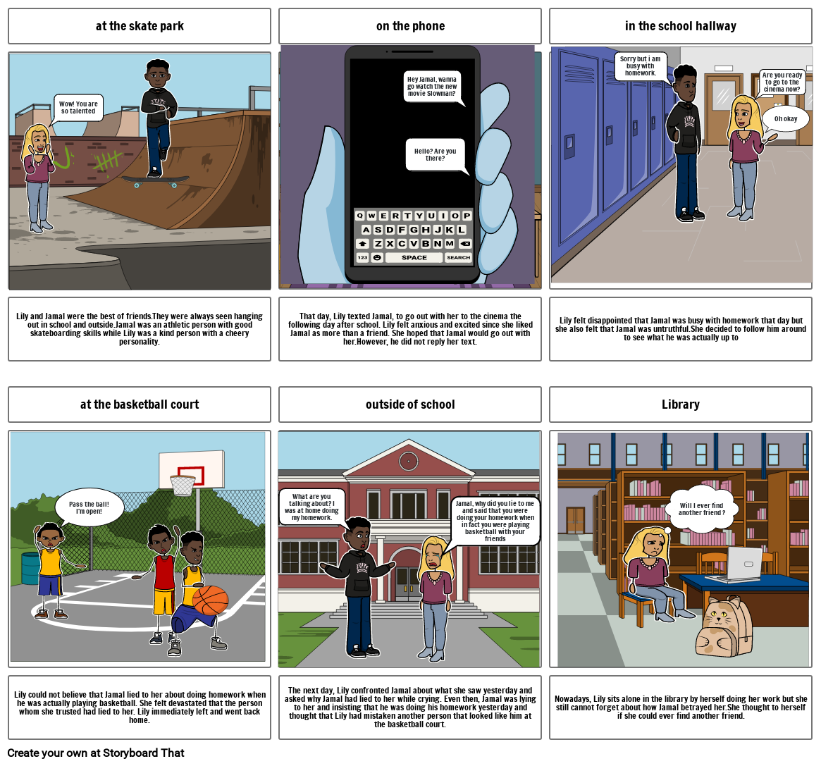 Lily could not believe that Jamal lied to her about doing homework when he was actually playing basketball. She felt devastated that the person whom she trusted had lied to her. Lily immediately left and went back home.