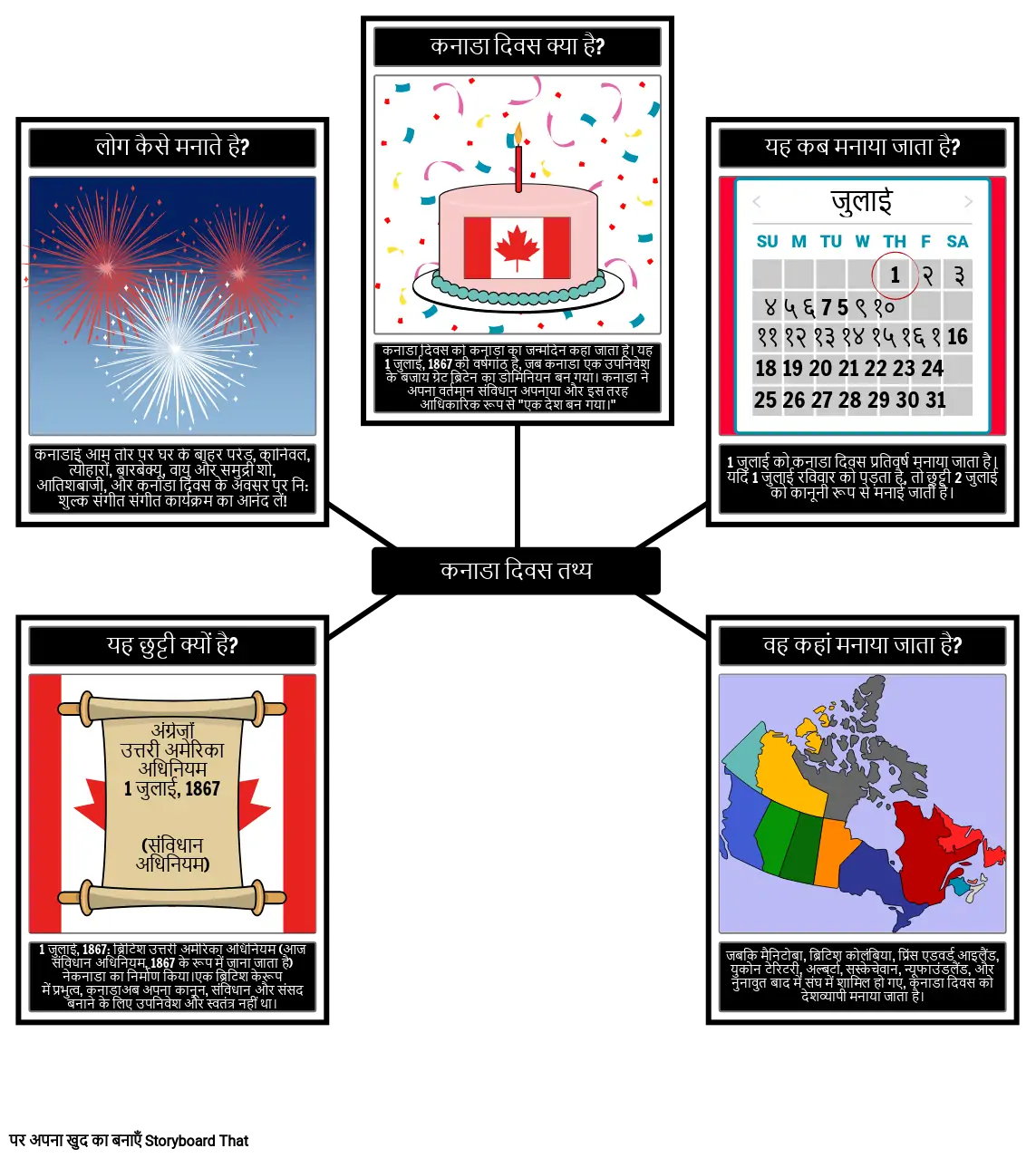 कनाडा दिवस को कभी-कभी कनाडा के जन्मदिन के रूप में जाना जाता है लेकिन यह उससे थोड़ा अधिक जटिल है! छात्र कनाडा दिवस के पीछे मुख्य तथ्यों की व्याख्या करने के लिए एक मकड़ी का नक्शा बना सकते हैं जैसे कि प्रश्न: कनाडा दिवस क्या है? यह कब है? वह कहां मनाया जाता है? यह छुट्टी क्यों बन गई? लोग कैसे मनाते है?