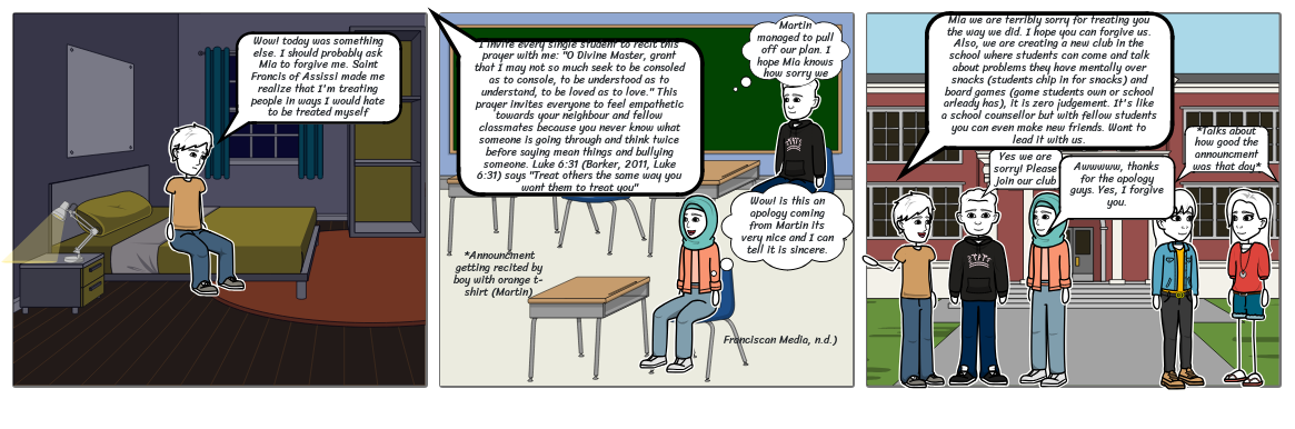 I invite every single student to recit this prayer with me: "O Divine Master, grant that I may not so much seek to be consoled as to console, to be understood as to understand, to be loved as to love." This prayer invites everyone to feel empathetic towards your neighbour and fellow classmates because you never know what someone is going through and think twice before saying mean things and bullying someone. Luke 6:31 (Barker, 2011, Luke 6:31) says "Treat others the same way you want them to treat you"