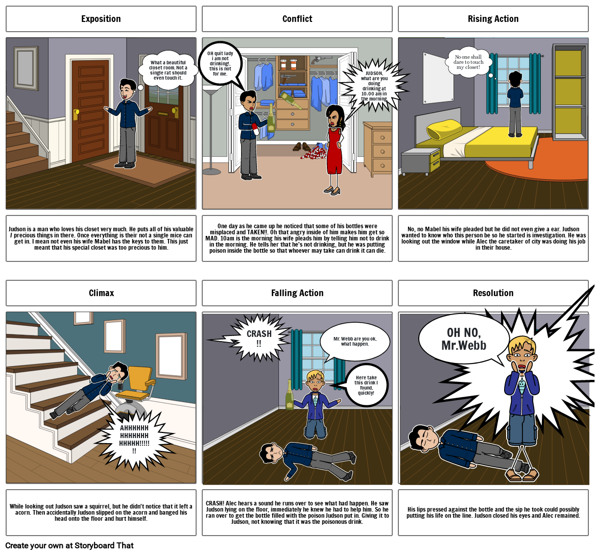 CRASH! Alec hears a sound he runs over to see what had happen. He saw Judson lying on the floor, immediately he knew he had to help him. So he ran over to get the bottle filled with the poison Judson put in. Giving it to Judson, not knowing that it was the poisonous drink.