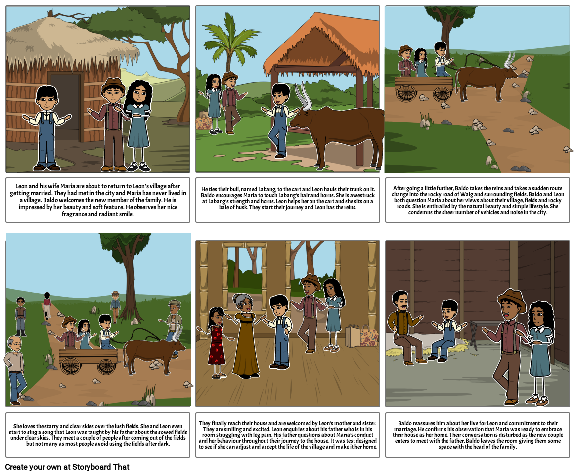 He ties their bull, named Labang, to the cart and Leon hauls their trunk on it. Baldo encourages Maria to touch Labang’s hair and horns. She is awestruck at Labang’s strength and horns. Leon helps her on the cart and she sits on a bale of husk. They start their journey and Leon has the reins.